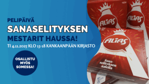 Osallistu kilpailuun myös SOMESSA kirjaston Facebook- ja Instagram-tileillä! Kaikkien somessa kilpailuun osallistuneiden kesken arvotaan kolme uudistettua Aatelinen Alias -peliä, jotka Tactic Games Oy lahjoittaa peliviikon ja 35 vuotta täyttävän Aliaksen kunniaksi!