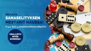 Osallistu kilpailuun myös SOMESSA kirjaston Facebook- ja Instagram-tileillä! Kaikkien somessa kilpailuun osallistuneiden kesken arvotaan kolme Aatelinen Alias -peliä.